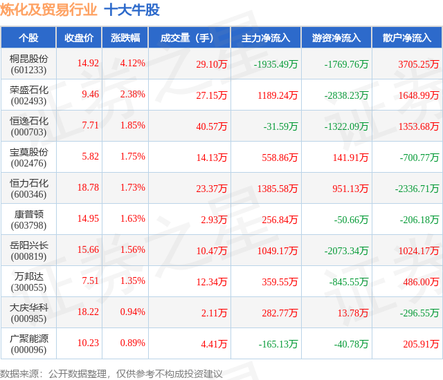 个股表现方面,炼化及贸易行业当日领涨股为桐昆股份(601233),该股当日报收14.92,上涨4.12%,成交量29.1万,主力资金净流出1935.49万元。荣盛石化(002493)以上涨2.38%紧随其后,该股当日成交量27.15万,主力资金净流入1189.24万元。除此之外,恒逸石化(000703)、宝莫股份(002476)、恒力石化(600346)均进入当日牛股之列。具体个股列表见下表: