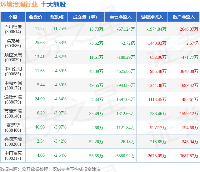 个股表现方面,环境治理行业当日领跌股为百川畅银(300614),该股当日报收11.27,下跌11.75%,成交量13.73万,主力资金净流出671.24万元。福龙马(603686)以下跌7.33%紧随其后,该股当日成交量73.62万,主力资金净流出2.72亿元。除此之外,顺控发展(003039)、中山公用(000685)、中电环保(300172)均进入当日熊股之列。具体个股列表见下表: