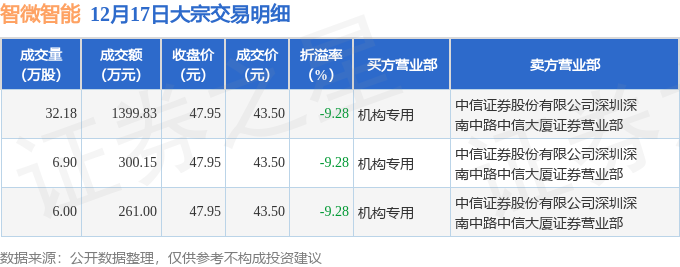 证券之星消息,12月17日智微智能发生大宗交易,交易数据如下: