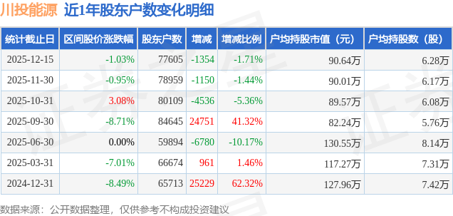 从股价来看,2025年11月30日至2025年12月15日,川投能源区间跌幅为1.03%,在此期间股东户数减少1354.0户,减幅为1.71%。