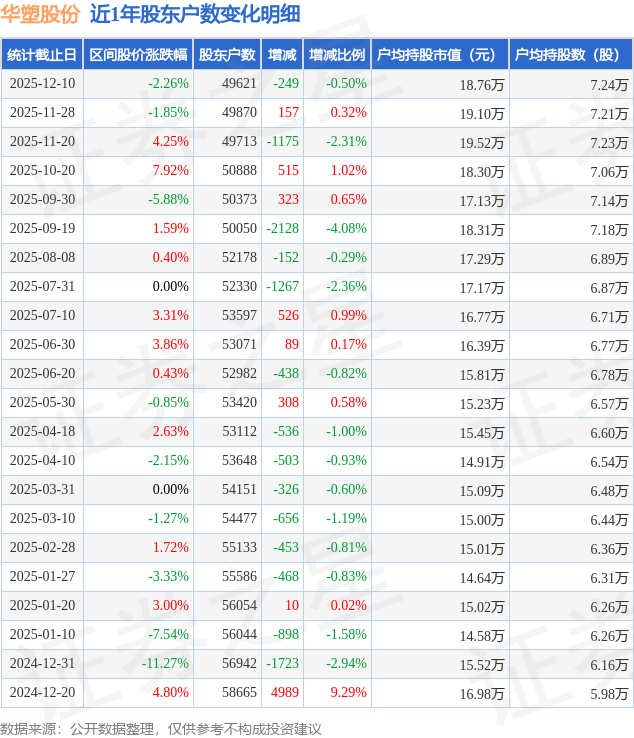 从股价来看,2025年11月28日至2025年12月10日,华塑股份区间跌幅为2.26%,在此期间股东户数减少249.0户,减幅为0.5%。