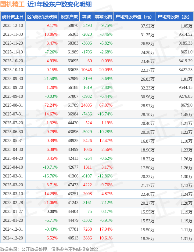 从股价来看,2025年11月30日至2025年12月10日,国机精工区间涨幅为9.17%,在此期间股东户数减少5493.0户,减幅为9.75%。