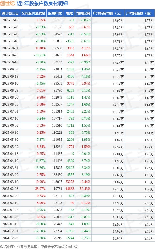 从股价来看,2025年11月28日至2025年12月10日,创世纪区间涨幅为1.55%,在此期间股东户数减少51.0户,减幅为0.05%。