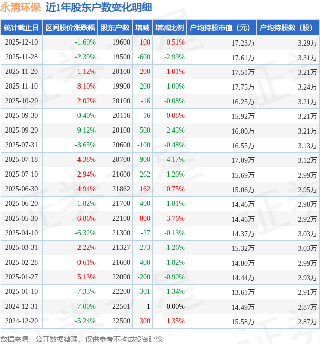 从股价来看,2025年11月28日至2025年12月10日,永清环保区间跌幅为1.69%,在此期间股东户数增加100.0户,增幅为0.51%。