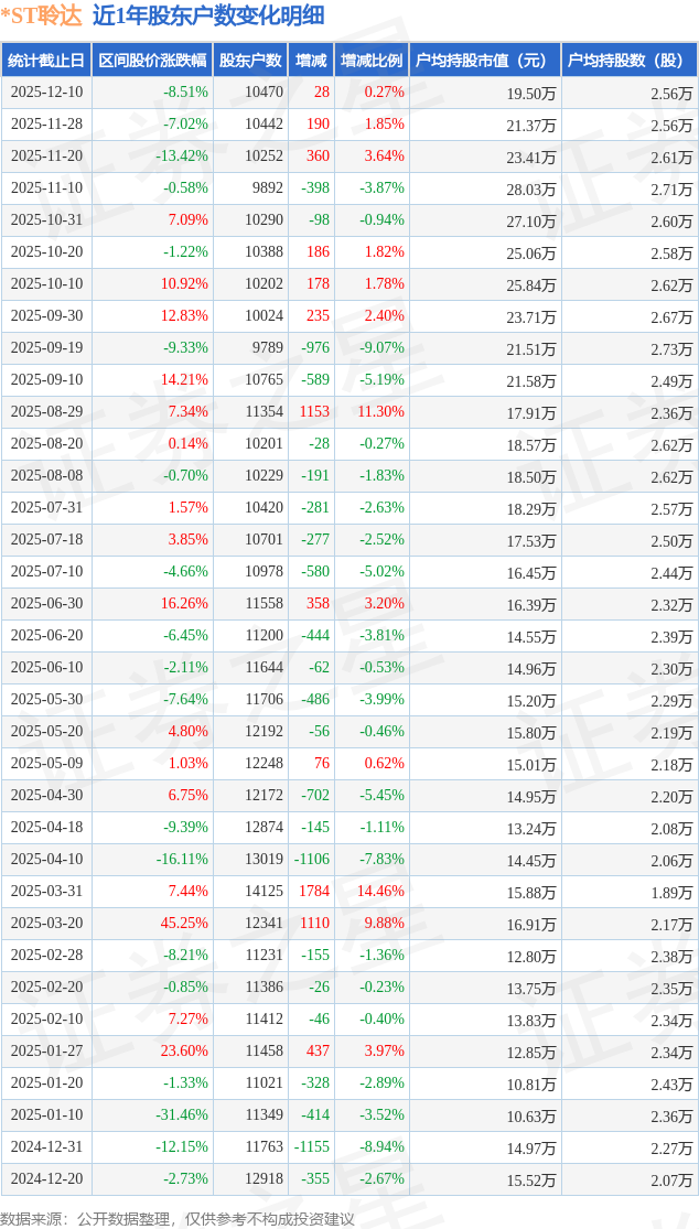 从股价来看,2025年11月28日至2025年12月10日,*ST聆达区间跌幅为8.51%,在此期间股东户数增加28.0户,增幅为0.27%。