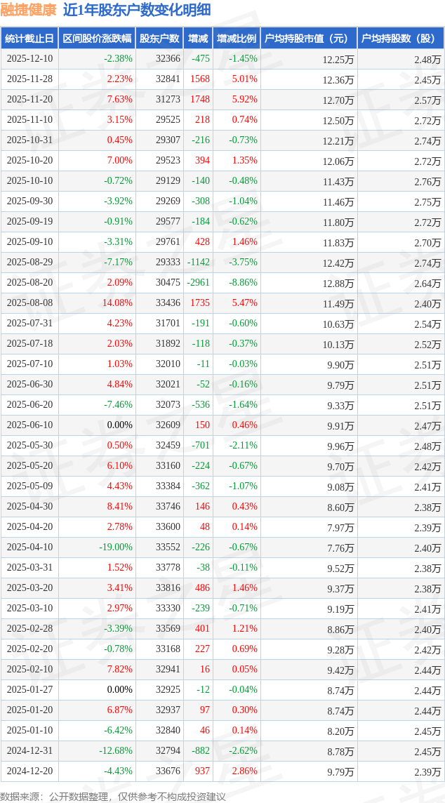 从股价来看,2025年11月28日至2025年12月10日,融捷健康区间跌幅为2.38%,在此期间股东户数减少475.0户,减幅为1.45%。
