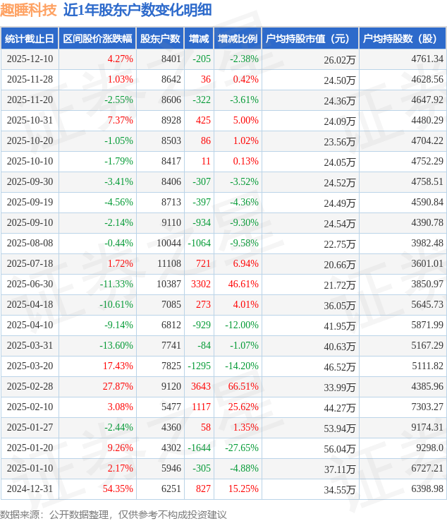 证券之星消息,近日趣睡科技披露,截至2025年12月10日公司股东户数为8401.0户,较11月20日减少205.0户,减幅为2.38%。户均持股数量由上期的4629.0股增加至4761.0股,户均持股市值为26.02万元。