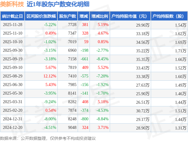 从股价来看,2025年11月10日至2025年11月28日,美新科技区间跌幅为5.22%,在此期间股东户数增加381.0户,增幅为5.19%。