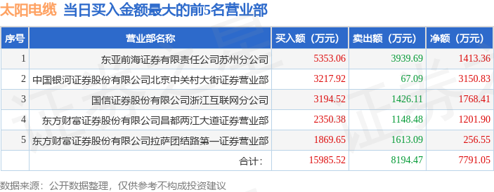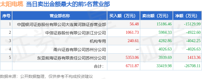 证券之星消息,沪深交易所2025年12月17日公布的交易公开信息显示,太阳电缆(002300)因日跌幅偏离值达到7%的前5只证券登上龙虎榜。此次是近5个交易日内第3次上榜。