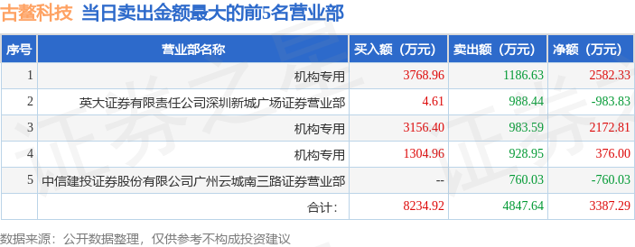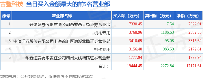 证券之星消息,沪深交易所2025年12月17日公布的交易公开信息显示,古鳌科技(300551)因日涨幅达到15%的前5只证券登上龙虎榜。此次是近5个交易日内第1次上榜。