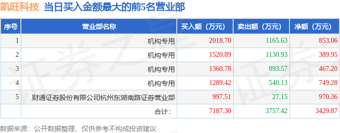 证券之星消息,沪深交易所2025年12月17日公布的交易公开信息显示,凯旺科技(301182)因日涨幅达到15%的前5只证券登上龙虎榜。此次是近5个交易日内第1次上榜。