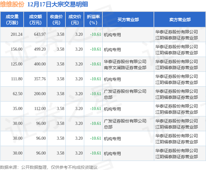 证券之星消息,12月17日维维股份发生大宗交易,交易数据如下: