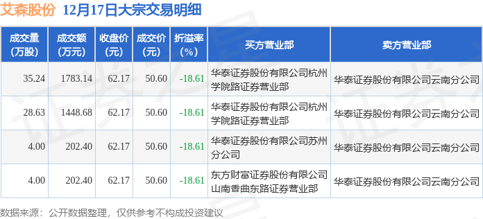 证券之星消息,12月17日艾森股份发生大宗交易,交易数据如下: