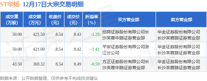 证券之星消息,12月17日ST华扬发生大宗交易,交易数据如下: