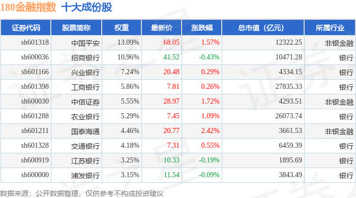 证券之星消息,12月17日,180金融(000018)指数报收于5889.81点,涨1.04%,成交529.94亿元,换手率0.29%。当日该指数成份股中,上涨的有30家,华泰证券以6.09%的涨幅领涨,下跌的有9家,渝农商行以1.11%的跌幅领跌。