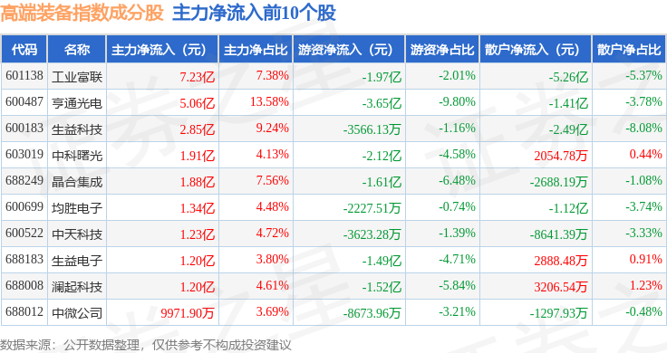 资金流向方面,高端装备(000097)指数成份股当日主力资金净流出合计4.9亿元,游资资金净流出合计14.73亿元,散户资金净流入合计19.62亿元。成份股资金流向详情见下表: