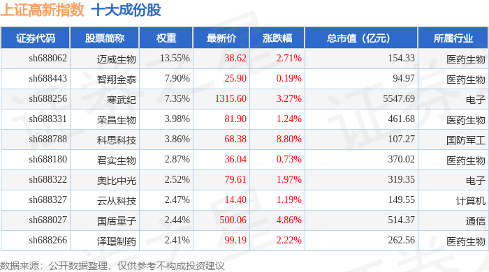 证券之星消息,12月17日,上证高新(000131)指数报收于3508.49点,涨2.06%,成交344.08亿元,换手率1.6%。当日该指数成份股中,上涨的有43家,科思科技以8.8%的涨幅领涨,下跌的有7家,七一二以2.99%的跌幅领跌。