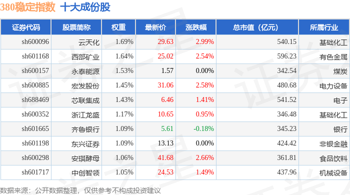 380稳定(000142)指数十大成份股详情如下:
