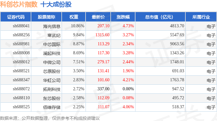 科创芯片(000685)指数十大成份股详情如下: