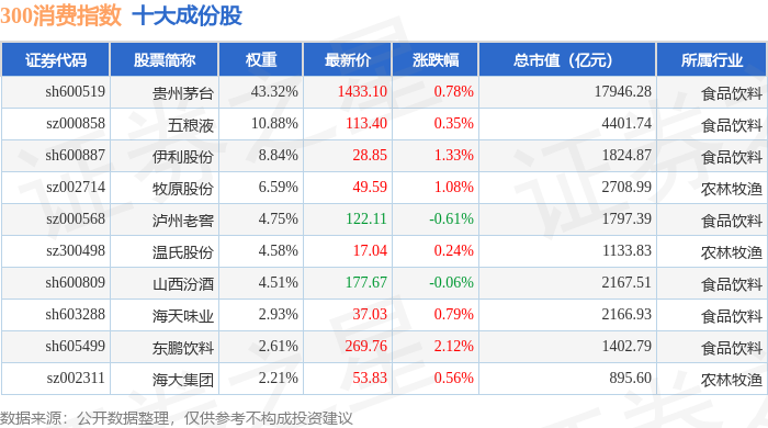 证券之星消息,12月17日,300消费(000912)指数报收于21375.24点,涨0.53%,成交142.44亿元,换手率0.52%。当日该指数成份股中,上涨的有12家,东鹏饮料以2.12%的涨幅领涨,下跌的有4家,古井贡酒以0.67%的跌幅领跌。