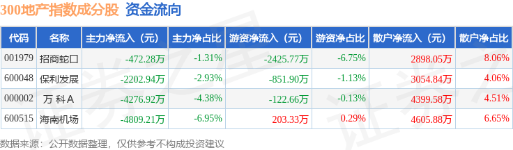资金流向方面,300地产(000952)指数成份股当日主力资金净流出合计1.18亿元,游资资金净流出合计3197.0万元,散户资金净流入合计1.5亿元。成份股资金流向详情见下表: