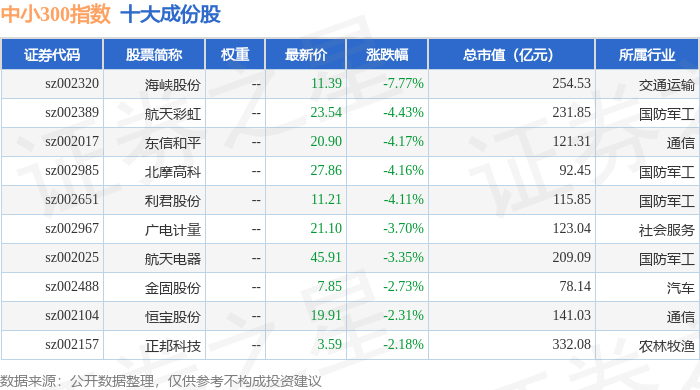 证券之星消息,12月17日,中小300(399008)指数报收于1594.89点,涨2.06%,成交1934.86亿元,换手率1.79%。当日该指数成份股中,上涨的有247家,美年健康以10.06%的涨幅领涨,下跌的有44家,海峡股份以7.77%的跌幅领跌。