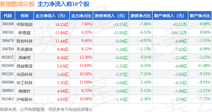 资金流向方面,新指数(399100)成份股当日主力资金净流入合计32.34亿元,游资资金净流出合计141.75亿元,散户资金净流入合计109.41亿元。成份股资金流向详情见下表: