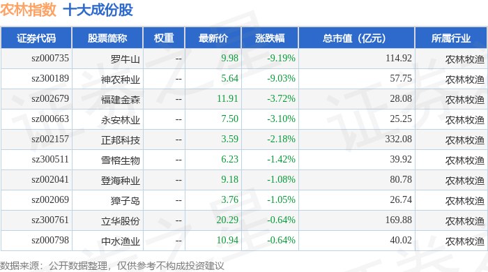 证券之星消息,12月17日,农林指数(399231)报收于1403.95点,跌0.06%,成交95.63亿元,换手率3.84%。当日该指数成份股中,上涨的有12家,众兴菌业以7.0%的涨幅领涨,下跌的有12家,罗牛山以9.19%的跌幅领跌。