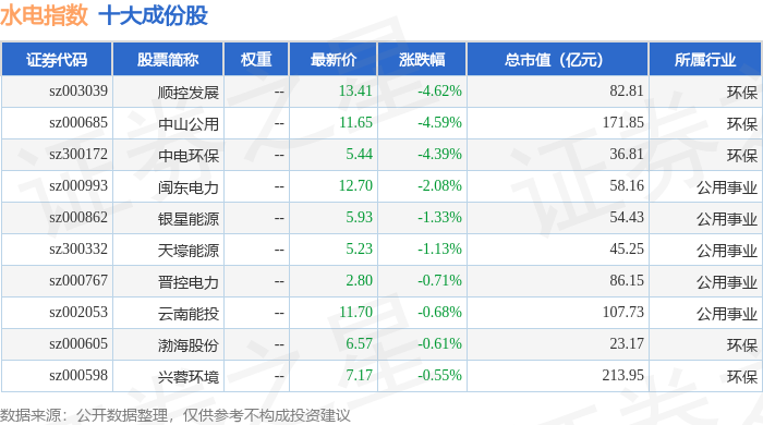 资金流向方面,水电指数(399234)成份股当日主力资金净流入合计1.08亿元,游资资金净流出合计1.02亿元,散户资金净流出合计552.46万元。成份股资金流向详情见下表:
