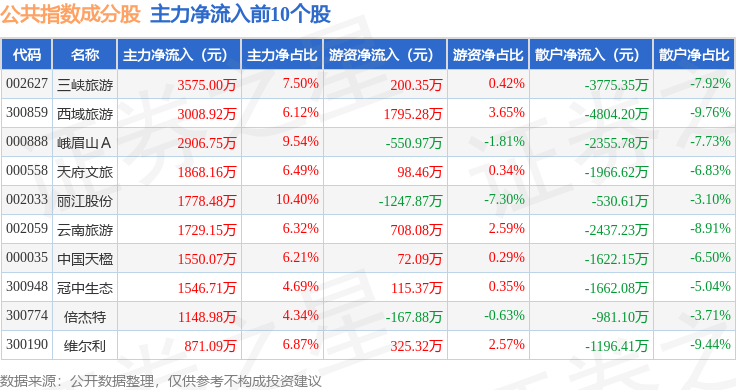 资金流向方面,公共指数(399244)成份股当日主力资金净流入合计1421.16万元,游资资金净流出合计339.34万元,散户资金净流出合计1081.83万元。成份股资金流向详情见下表: