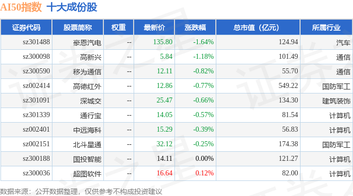 证券之星消息,12月17日,AI50(399284)指数报收于3645.61点,涨2.19%,成交433.36亿元,换手率2.36%。当日该指数成份股中,上涨的有41家,卫宁健康以7.01%的涨幅领涨,下跌的有8家,豪恩汽电以1.64%的跌幅领跌。