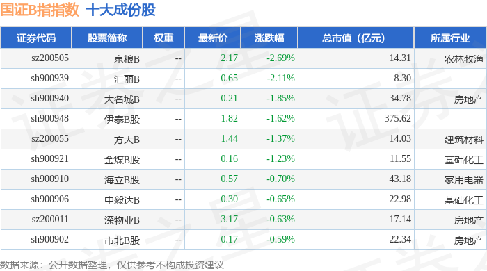 国证B指(399318)指数十大成份股详情如下: