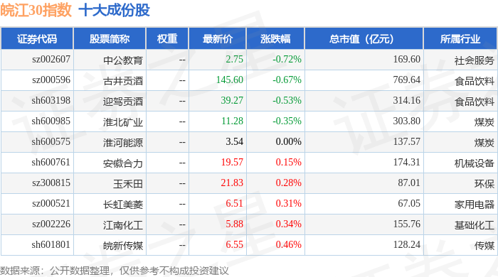 皖江30(399350)指数十大成份股详情如下: