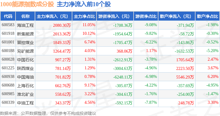 资金流向方面,1000能源(399381)指数成份股当日主力资金净流出合计1.25亿元,游资资金净流出合计2.54亿元,散户资金净流入合计3.79亿元。成份股资金流向详情见下表: