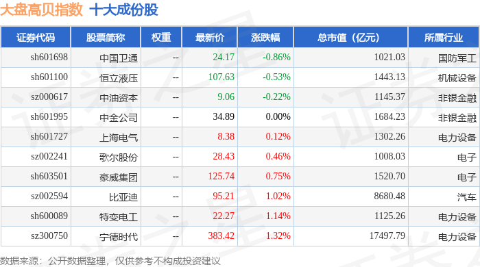 证券之星消息,12月17日,大盘高贝(399405)指数报收于3083.2点,涨3.02%,成交2011.39亿元,换手率1.53%。当日该指数成份股中,上涨的有46家,新易盛以9.55%的涨幅领涨,下跌的有3家,中国卫通以0.86%的跌幅领跌。