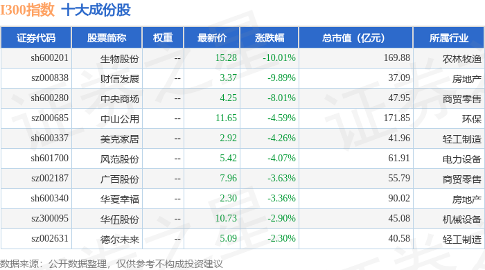 证券之星消息,12月17日,I300(399416)指数报收于4679.35点,涨1.38%,成交464.57亿元,换手率0.2%。当日该指数成份股中,上涨的有198家,百大集团以10.01%的涨幅领涨,下跌的有73家,生物股份以10.01%的跌幅领跌。
