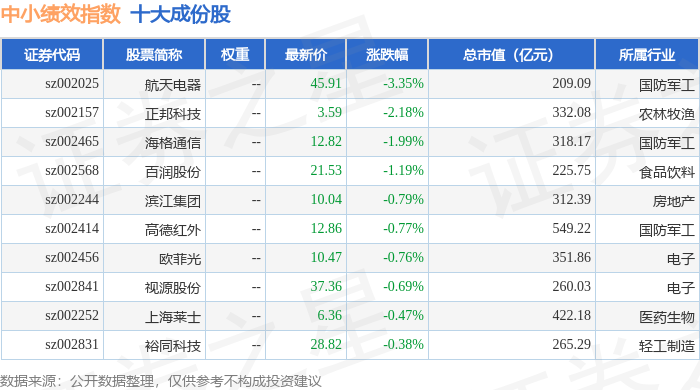 中小绩效(399658)指数十大成份股详情如下: