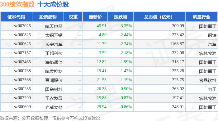 300绩效(399657)指数十大成份股详情如下: