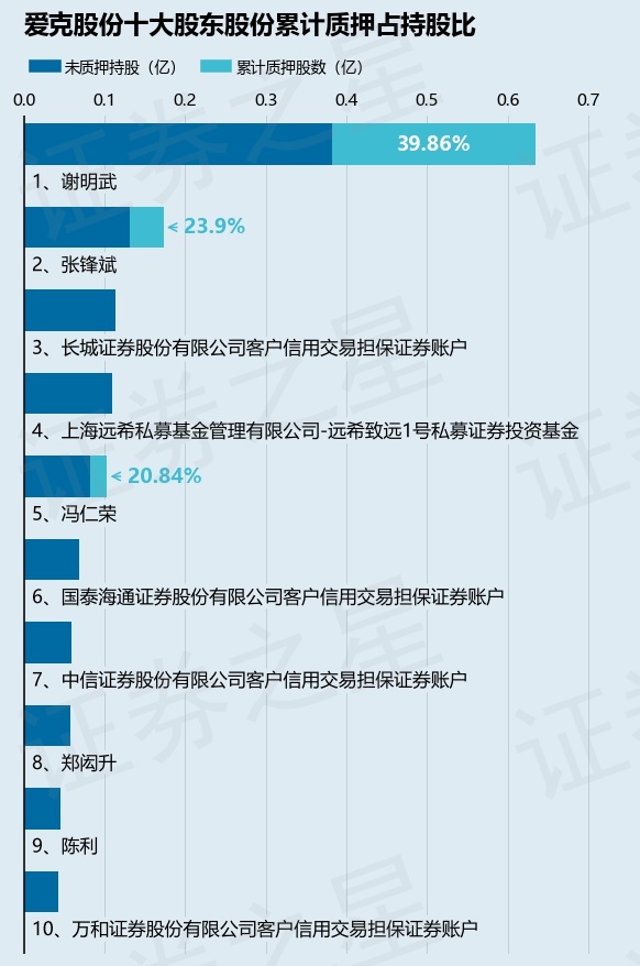 截止本公告日,股东谢明武已累计质押股份2529.7万股,占其持股总数的39.86%,股东张锋斌已累计质押股份414.0万股,占其持股总数的23.9%,股东冯仁荣已累计质押股份215.0万股,占其持股总数的20.84%。本次质押后爱克股份十大股东的累计质押股份占持股比例(占持股比例的计算以公司最新一期财务报表公布的十大股东的持股总数为基准)见下图:
