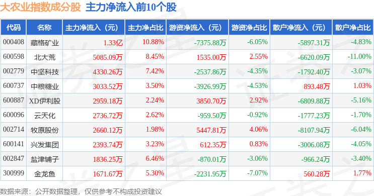 资金流向方面,大农业(399814)指数成份股当日主力资金净流入合计9152.4万元,游资资金净流出合计1.65亿元,散户资金净流入合计7303.08万元。成份股资金流向详情见下表: