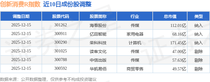 近10日内创新消费R(470041)指数成份股做了调整,新纳入了3只股票,剔除了3只股票。