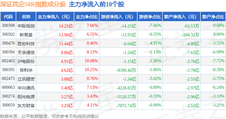 资金流向方面,深证民企50R(470057)指数成份股当日主力资金净流入合计68.93亿元,游资资金净流出合计45.79亿元,散户资金净流出合计23.15亿元。成份股资金流向详情见下表: