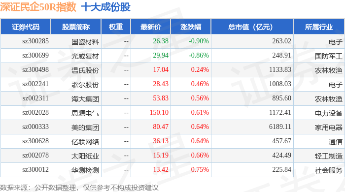 证券之星消息,12月17日,深证民企50R(470057)指数报收于3995.71点,涨3.12%,成交1569.34亿元,换手率1.57%。当日该指数成份股中,上涨的有48家,新易盛以9.55%的涨幅领涨,下跌的有2家,国瓷材料以0.9%的跌幅领跌。