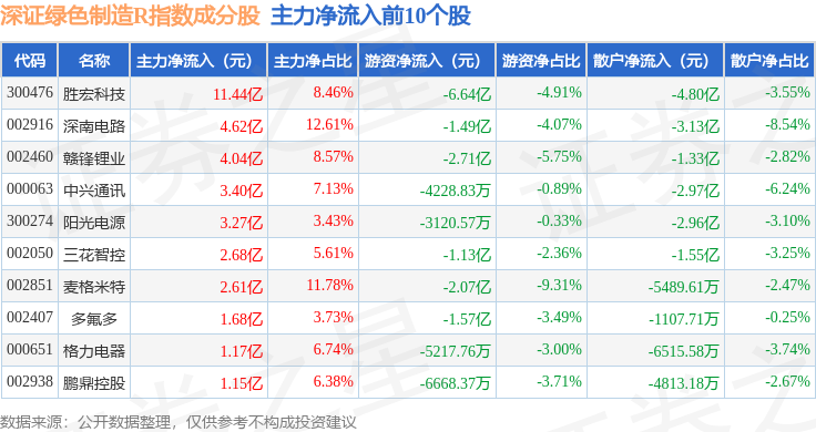 资金流向方面,深证绿色制造R(470069)指数成份股当日主力资金净流入合计23.92亿元,游资资金净流出合计21.67亿元,散户资金净流出合计2.26亿元。成份股资金流向详情见下表: