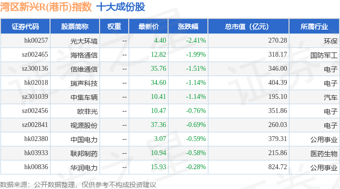 湾区新兴R(港币)(480008)指数十大成份股详情如下: