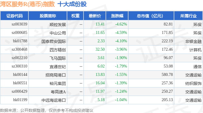 湾区服务R(港币)(480012)指数十大成份股详情如下: