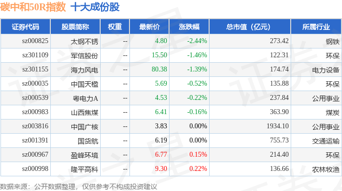 证券之星消息,12月17日,碳中和50R(480021)指数报收于2453.79点,涨1.89%,成交351.92亿元,换手率0.97%。当日该指数成份股中,上涨的有42家,多氟多以6.61%的涨幅领涨,下跌的有6家,太钢不锈以2.44%的跌幅领跌。
