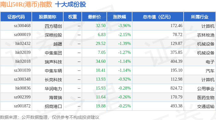南山50R(港币)(480024)指数十大成份股详情如下: