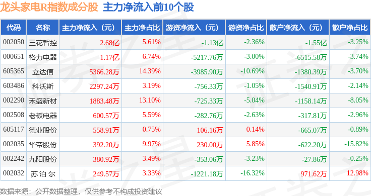 资金流向方面,龙头家电R(480028)指数成份股当日主力资金净流入合计1.81亿元,游资资金净流出合计1.61亿元,散户资金净流出合计1975.77万元。成份股资金流向详情见下表: