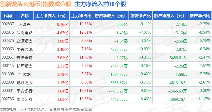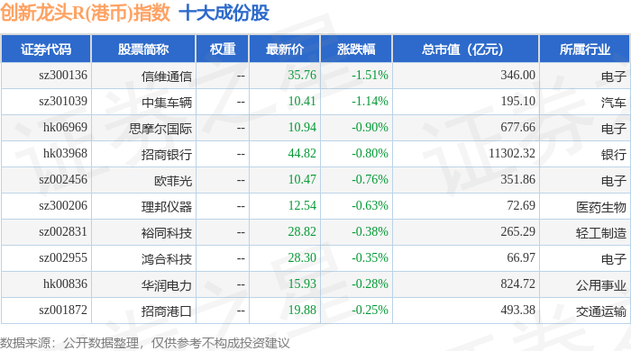 创新龙头R(港币)(480037)指数十大成份股详情如下: